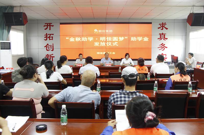 8月28日上午,明佳集團工會“金秋助學·明佳圓夢”助學金發(fā)放儀式在集團公司三樓會議室舉行,為8個考取大學的職工子女發(fā)放助學金共計9600元。總裁陳云、副總經(jīng)理鐘寒參加發(fā)放儀式,儀式由工會主席高斐斐主持。