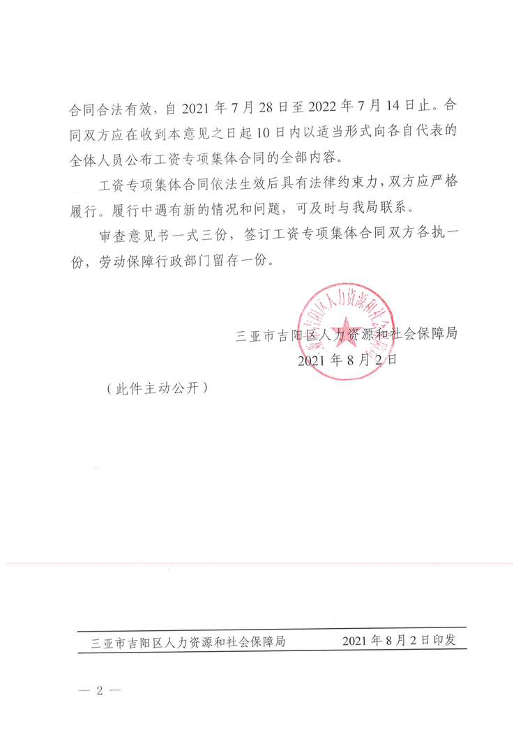 2021年8月2日,吉陽區(qū)人社局審查通過我公司《企業(yè)工資專項集體合同》。8月4日報三亞市總工會基層工作部備案。至此,三亞明佳園林環(huán)衛(wèi)集團(tuán)有限公司2021年度企業(yè)工資集體協(xié)商工作圓滿結(jié)束。