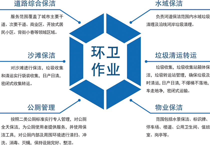 道路綜合保潔、水域保潔、沙灘保潔、垃圾清運(yùn)轉(zhuǎn)運(yùn)、公廁管理